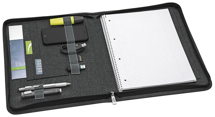 Sok zseb és rugalmas, gumírozott hurkok biztosítanak helyet kártyák, tollak és kiegészítők számára