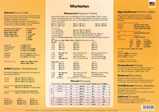 Az A3 méretű német nyelvi asztali alátét egyik oldalán a szó és mondatképzéssel, a hátoldalon a szófajokkal kapcsolatos tudnivalók találhatók.