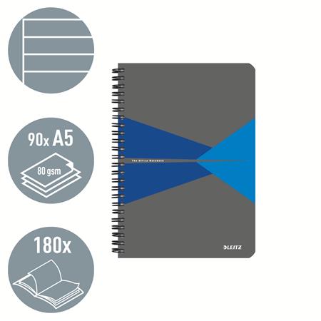 Spirálfüzet, A5, vonalas, 90 lap, PP borító, LEITZ "Office", szürke-kék