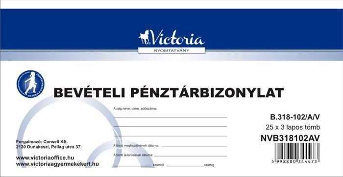Nyomtatvány, bevételi pénztárbizonylat, 25x3, VICTORIA PAPER "B.318-102", 10 tömb/csomag